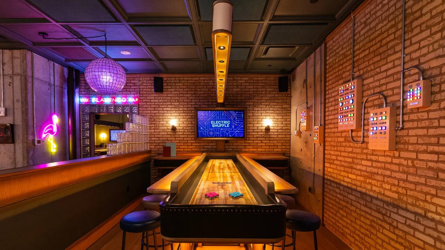 Electric Shuffle in New York is part cocktail bar, part competitive playground—built around “shuffleboard, but make it modern.” Instead of squinting at a dusty scoreboard, you play on polished, full-length shuffle lanes with tech-assisted scoring and game modes that keep the pace moving (and the rivalries friendly). It’s the kind of place where strangers become teammates fast, and your group chat gets a new inside joke by round two. The vibe is upbeat and social: bright, stylish interiors, neon pops, and a soundtrack that leans lively—especially later in the week when the room shifts into full night-out mode. You can drop in for drinks at the bar, but the sweet spot is booking a lane with friends so you’ve got a “home base” while you rotate between rounds, cocktails, and shared bites. Drinks are a big part of the draw—expect crowd-pleasers and party-friendly cocktails (their espresso martinis get a lot of love), plus beer, wine, and zero-proof options so everyone can stay in the mix. Food is designed for groups: snackable, sharable, and easy to eat between turns, whether you’re there for a casual hang or celebrating something. If you’re looking for an activity-led bar that still feels like a proper night out—more “experience” than “sports bar,” more “play” than “performance”—Electric Shuffle is an easy win for birthdays, date nights with a twist, and group meetups that need something better than “let’s just sit at a table.”